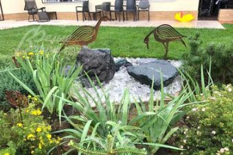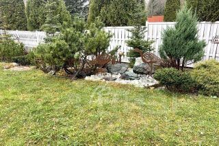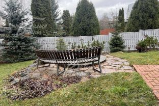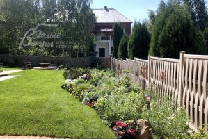 Благоустройство участка: на участке - богатый ландшафтный дизайн: высажены декоративные растения и кустарники, в том числе голубая ель, норвежские пихты, горные сосны и можжевельник, а со стороны таунхаусов вдоль забора — крупномерные сосны. Зелёное оформление также включает многолетние цветы. На территории выполнено освещение, дорожки вымощены клинкерной брусчаткой. Уютная зона отдыха — костровая площадка с чашей для костра, грилем и веерообразной скамьёй патио со спинкой. Дополняют облик участка малые архитектурные формы: олени, птицы и цветы из кортеновской стали. По участку и вокруг дома обустроен дренаж. Перед домом расположена парковка на шесть автомобилей, вымощенная клинкерной брусчаткой и оборудованная дренажной системой.