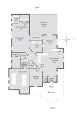 • Первый этаж — для энергии: Профессиональная бильярдная (43 м²), настоящая финская сауна, гостиная с камином (34 м²) потолок 6 метров, гараж на 2 авто и открытая терраса