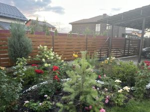 На участке посеян газон, разбиты клумбы. Участок оснащен автоматическим воротами.