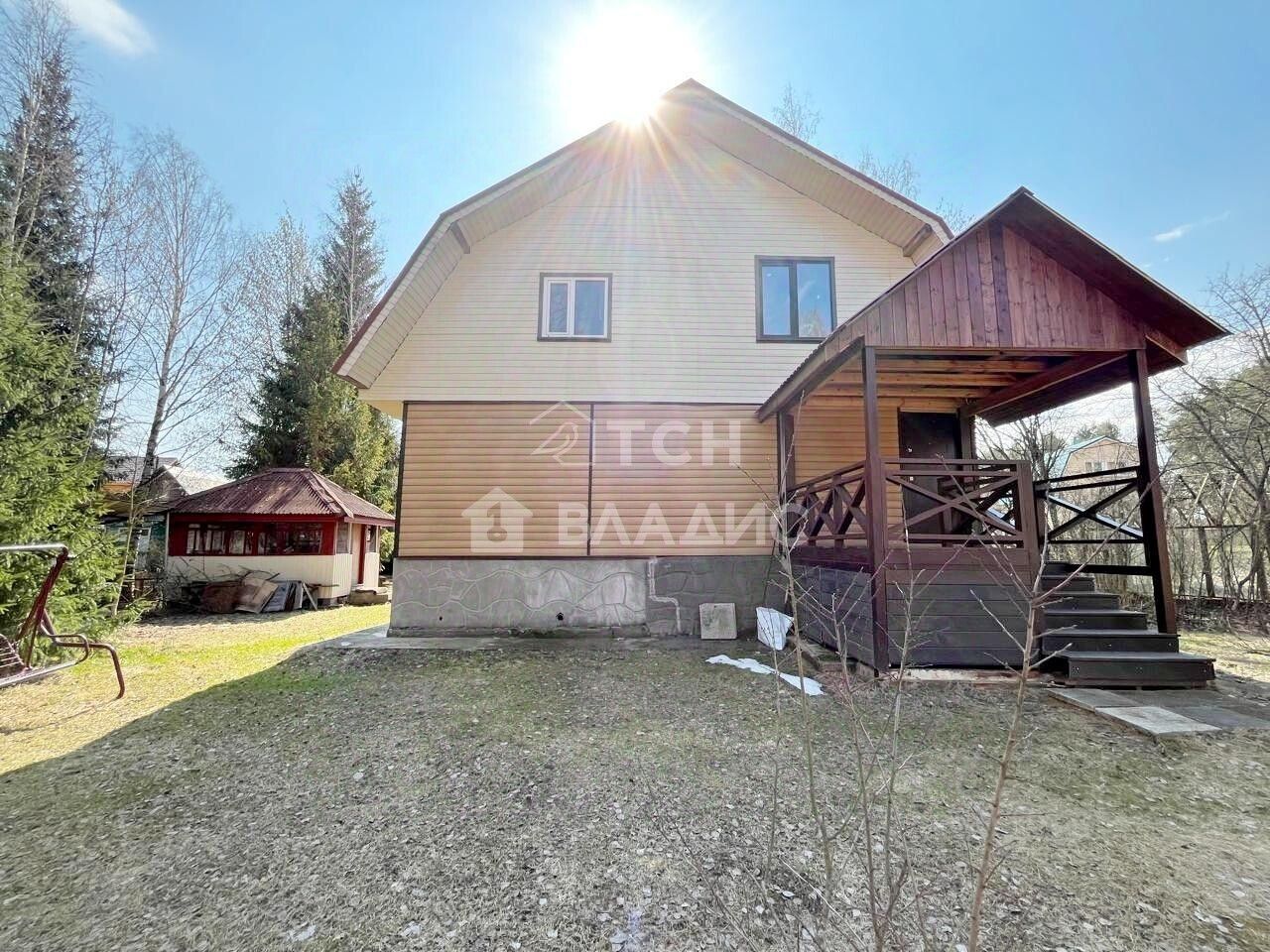 Сам дом построен из бруса утеплен и обшит сайдингом. Крыша - металлочерепица. При входе открытая веранда.