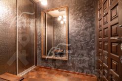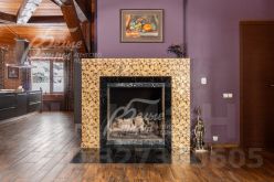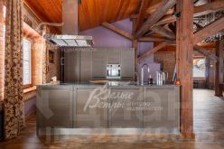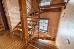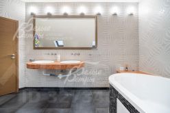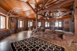 Описание внутренней отделки: в доме выполнена дизайнерская отделка с элементами стиля лофт с использованием высококачественных материалов премиумкласса. Стены оформлены обоями, венецианской штукатуркой, в гостиной кирпич, обработанный специальной пропиткой, санузлы отделаны плиткой. На полу паркетная доска, ламинат, натуральный шпон, в гостиной плитка с подогревом. Потолки на первом этаже в общих помещениях — бетонные (в духе лофтстилистики), на втором — отделаны лиственницей, натяжные потолки в спальнях оснащены подсветкой по периметру и встроенными светильниками. Установлены двери немецкого производства с хорошей шумоизоляцией и деревянные подоконники. На второй этаж ведёт лестница с каркасом и ступенями из массива дуба, коваными поручнями и перилами. В гостиной расположен большой открытый камин, ещё один камин находится в холле первого этажа. В отделке порталов каминов и ступеней внутри дома применён натуральный мрамор.