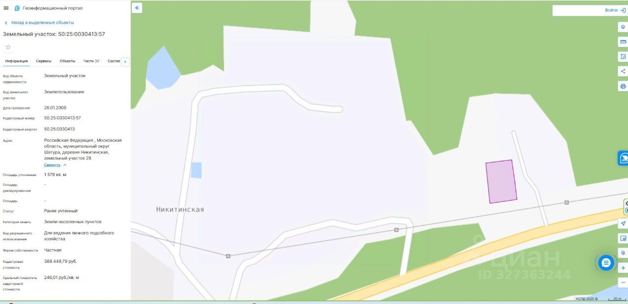 Продаётся (одна вторая) доли в праве общей долевой собственности на земельный участок площадью 1579 (одна тысяча пятьсот семьдесят девять) кв.м с кадастровым номером 50:25:0030413:57 по адресу: Российская Федерация , Московская область, муниципальный округ Шатура, деревня Никитинская, земельный участок 28, земельный участок расположен на землях населенных пунктов, предоставлен для ведения личного подсобного хозяйства.