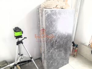 Сан узел в законченном виде: стены и пол в крупноформатном керамограните, разводка всей сан техники, встроенная инсталляция, ванна.