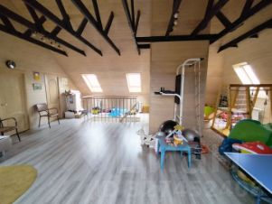 В доме: 1 эт: кухня, гостиная с камином, постирочная, бойлерная, СУ, гостевая комната; 2 эт.: кабинет, мастер-спальня со своим СУ, 3 спальни и кабинет, санузел; 3 эт.: полноценный мансардный этаж в стиле ореnsрасе оборудован как игровая и спортивная площадка, здесь разместились: настольный теннис, тренажеры, детская горка и пр., есть подсобные помещения для хранения. Дом полностью меблирован.