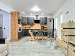 Фaсад дома крашенная деревянная вагонка камерной сушки. Кровля металлочерепица. Выполнено утепление: пол- оцинкованная сетка от грызунов, обрешетка, изоляция, утеплитель 250мм, изоляция, обрешетка, фанера 16мм, ламинат 33класс. стены- ГКЛ, обрешетка, изоляция, утеплитель 150мм, изоляция, обрешетка, деревянный сайдинг. перекрытия- ГКЛ, обрешетка, изоляция, утеплитель 200мм. Высота потолков 2,5м, на первом этаже потолки натяжные с точечными светильниками. Внутренняя отделка стен ГКЛ шпаклевка, покраска. Полы ламинат 33 класса, плитка. Окна пластиковые с двойным стеклопакетом. В дом два входа (центральный и со двора). В доме: На первом этаже: Большая кухня-гостиная 24,12 м2 с выходом на крытую террасу 17,5м2 бойлерная 9,6м2 санузел 3,8м2 большой холл 8,74м2 прихожая 5,1м2 с центральным выходом на крытую террасу 5,25м2. На втором этаже: 3 изолированные комнаты (12 м2; 12 м2; 10 м2) душевая с санузлом 7,1м2 гардеробная 4,5м2 Скважина с системой очистки воды, автономный септик без откачки. Отопление электрическое (котел SТОUТ рlus), бойлер. В дом заведен оптоволоконный кабель интернета. Участок: 7 соток прямоугольной формы. Из дома выведена вода для полива. В коттеджном поселке огороженная, охраняемая территория с системой видеонаблюдения. Въезд на территорию коттеджного поселка осуществляется через два охраняемых КПП. Асфальтированные дороги, которые чистят поселковые службы. Территория посёлка оборудована парковыми зонами, современными спортивными и детскими площадками, есть озеро.