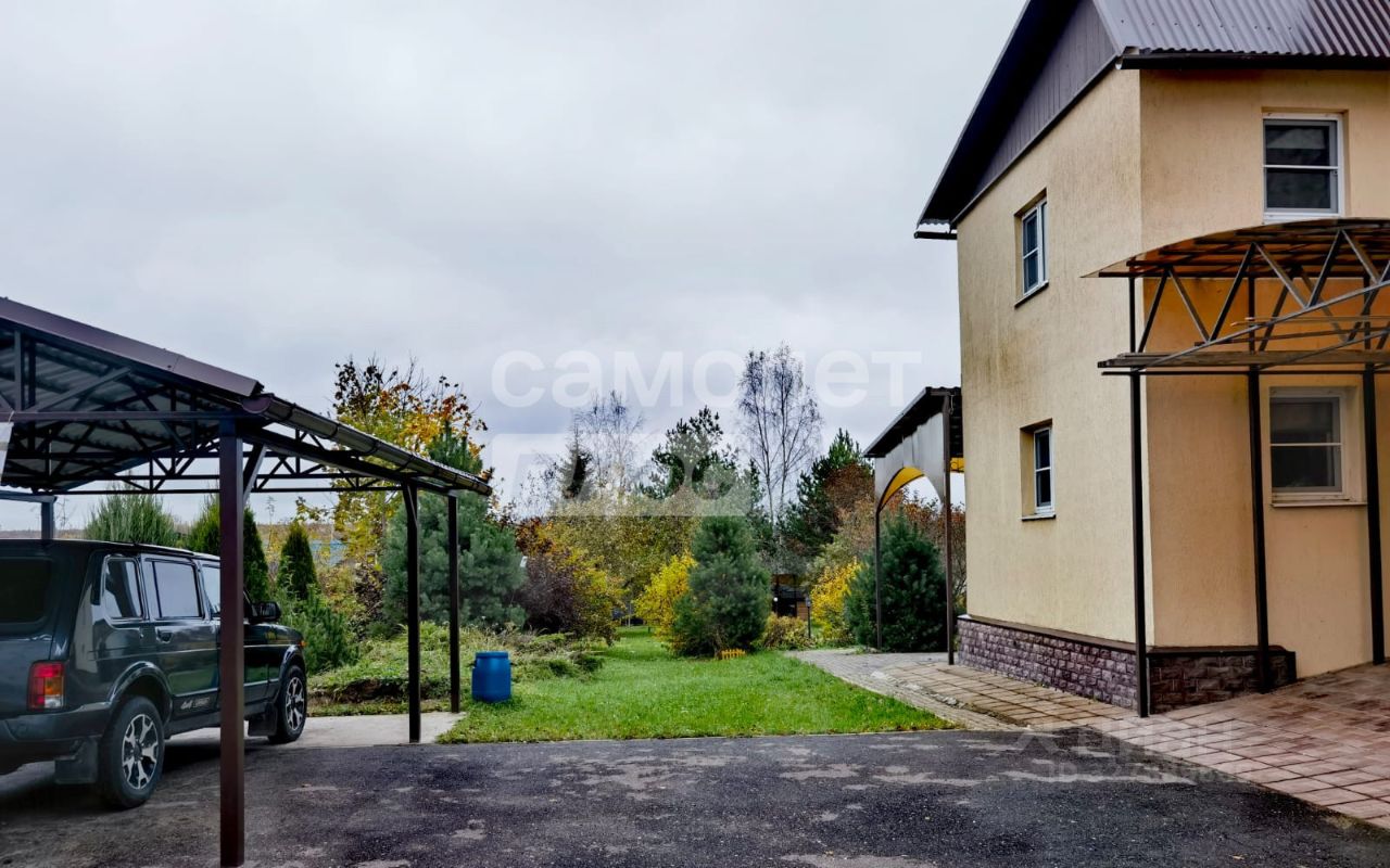 При въезде асфальтированная площадка с парковочными местами и автомобильным навесом.