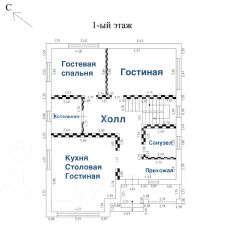 1 эт: прихожая, холл, просторная кухня-столовая-гостиная с окнами в пол и с выходом в сад, гостевая спальня, еще одна гостиная или кабинет, санузел, кладовая и котельная;