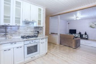 1ый этаж: кухня-столовая, изолированная комната, зимний сад, санузел, котельная, тамбур; выход на 2 стороны дома.