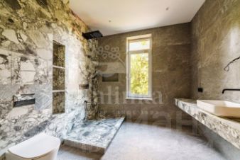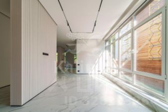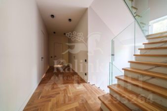 В отделке использованы высококачественные натуральные материалы, панорамные окна, высота потолков составляет 3,6 метра, балкон на втором этаже снабжен перилами из закаленного стекла. Эксплуатируемая кровля позволяет организовать дополнительное пространство для отдыха и наслаждаться прекрасным видом на поселок.