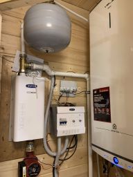 Бойлер на 100 л + утепленный ввод ПНД с греющим кабелем - вода не замерзнет даже в -30C. Все комплектующие - премиум-класса TECE, гребенка FAR, проводка Конкорд NUM с автозащитой ABB.