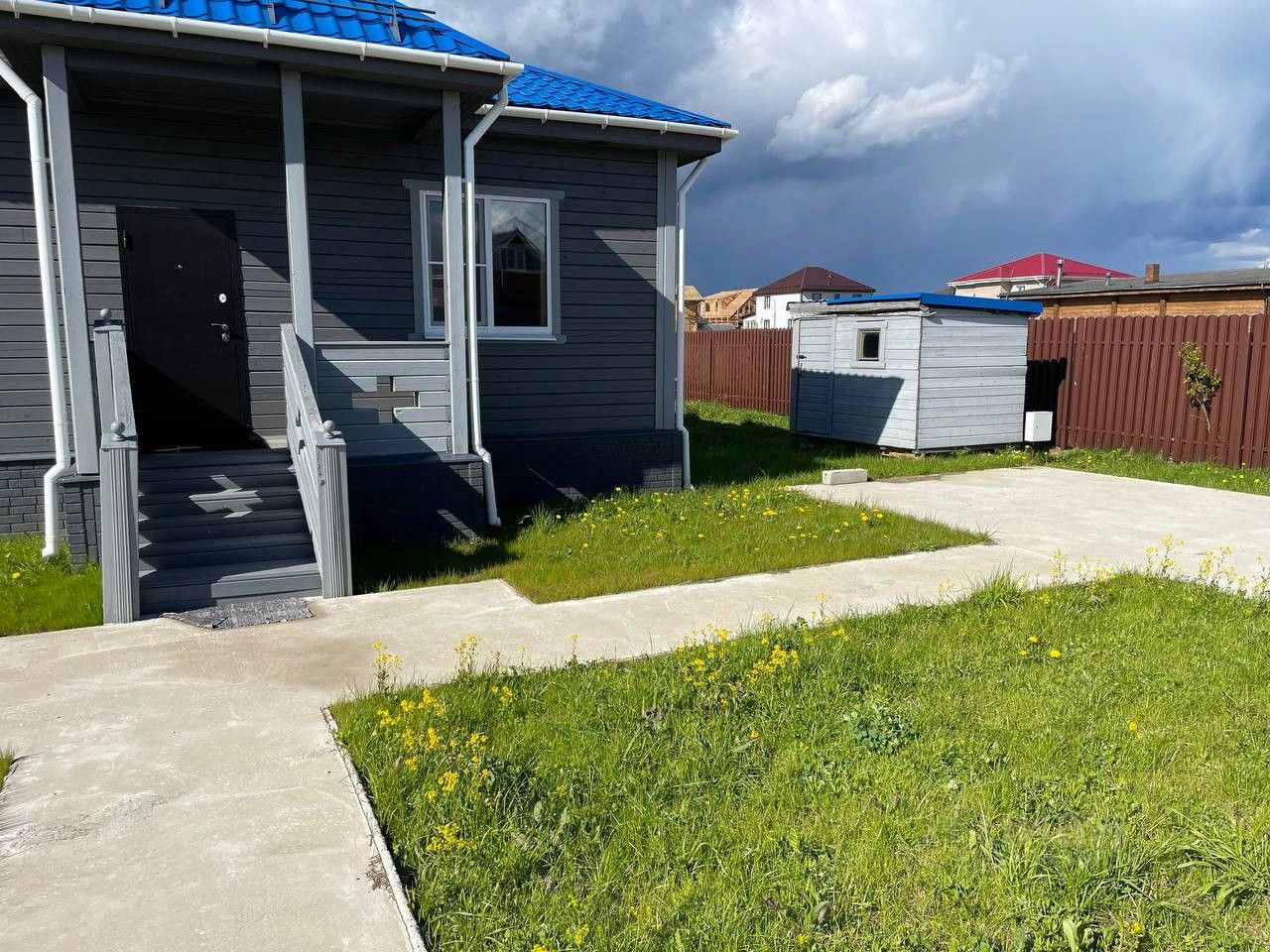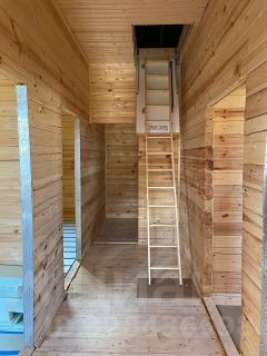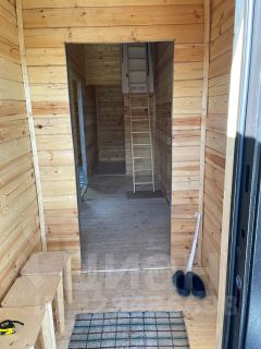 В доме две спальни, кухня-гостиная, сан узел. Дом (9м х7,5м) из профбруса камерной сушки В140хГ190. Перекрытия-деревянные лаги, обработанные антисептиком, ж/б сваи. Снаружи дом покрыт цв. маслом OSMO. Пол деревянный, потолок (высота 3м) вагонка. Окна стеклопакеты. Установлена железная входная дверь.