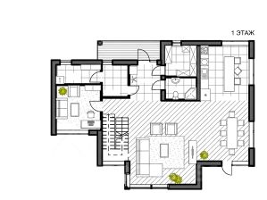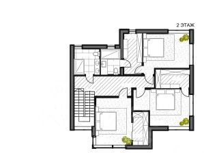На первом этаже просторный холл, гостевой санузел, гостиная, кухня-столовая, котельная, кабинет. На втором этаже 3 спальни. Мастер спальня имеет свой санузел и гардеробную. В доме всего 4 спальни, 3 санузла.