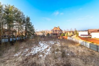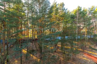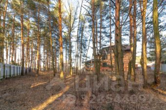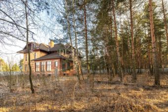 Коттедж расположен на участке правильной формы с лесными деревьями.