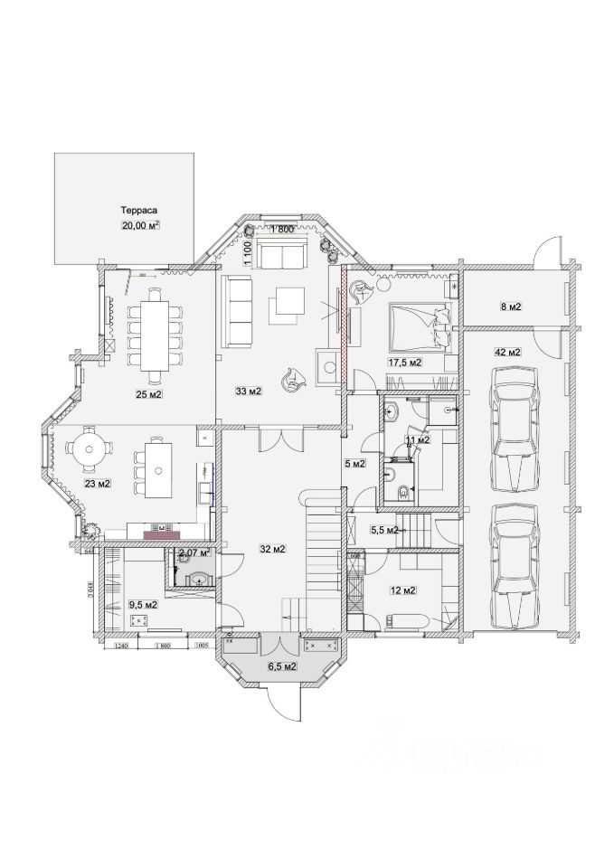 Спальня (17,5 м²): Комфортная площадь гостевой спальни на первом этаже.