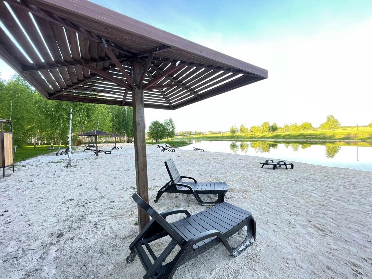 Пляжи с белым песком и оборудованная зона для пикников в березовой роще с видом на озеро.