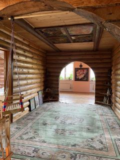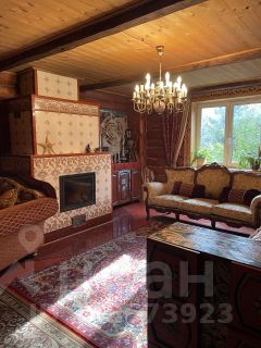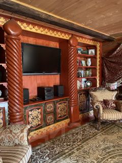 Просторная уютная гостиная с печью в лучших русских традициях, а также большой книжный стеллаж ручной работы.