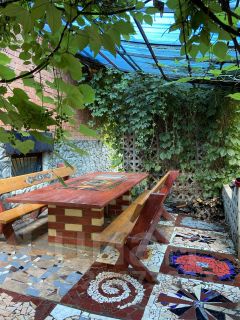 На участке есть мангальная зона с беседкой и большим столом, прохладное патио в тени винограда.