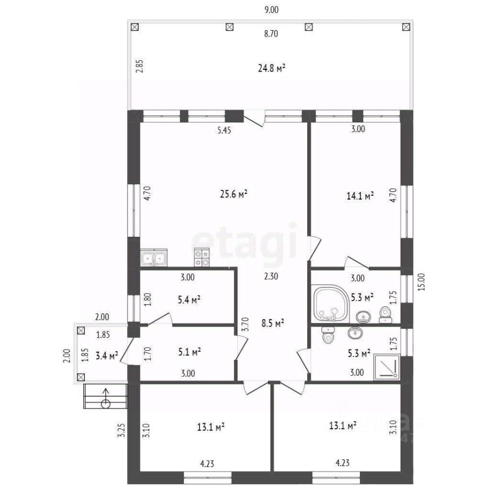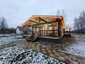 Планировка продумана для удобства семьи: прихожая, три отдельные комнаты, просторная кухня-гостиная с прямым выходом на веранду, подсобное помещение и два санузла.