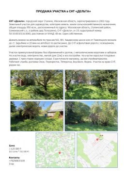 Земельный участок для садоводства, категория земель: земли сельскохозяйственного назначения, общая площадь 950 кв.м., расположенный по адресу: Московская область, Ступинский район, Семеновский с.о., в районе дер.Полушкино, СНТ Дельта, уч.19, кадастровый номер 50:33:0010116:0040, расстояние от МКАД: 48 км. Один cобcтвенник.