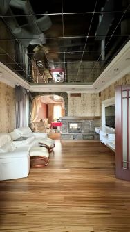 Первый этаж и цоколь: стильная гостиная с камином, зимний сад, спортзал, сауна и собственный бассейн. Гараж на две машины.