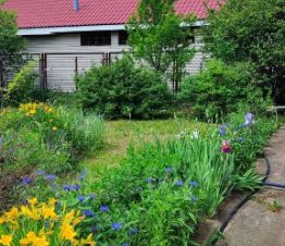 Участок в 10 соток ухоженный, множество цветов и плодовых деревьев.