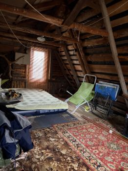 На первом этаже находится просторная кухня-столовая с деревянными стенами и потолком, создающими теплую атмосферу. Есть цифровое ТВ. На втором этаже расположена спальня недоделанная.