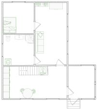 Планировка: на первом этаже небольшая веранда, кухня-гостиная, зал, С-У и спальная.