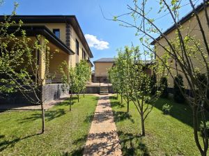 Продуманный ландшафтный дизайн: дорожки из брусчатки, газон, лиственные и вечнозелёные насаждения. Въезд — асфальт, внутри посёлка — дорога из асфальтовой срезки (отличное состояние).