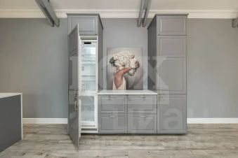 Кухонная зона — 35 кв.м: Здесь свободно помещается техника, и обеденная группа на 8 персон. Хозяйке — раздолье, гостям — не тесно!