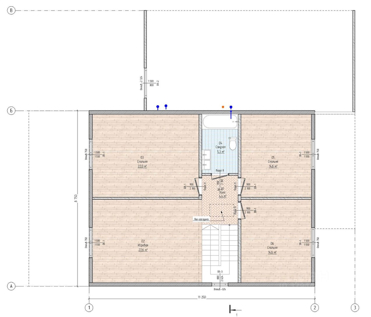 2й этаж: две детские комнаты, спальня с гардеробом, ванная комната, гостиная.