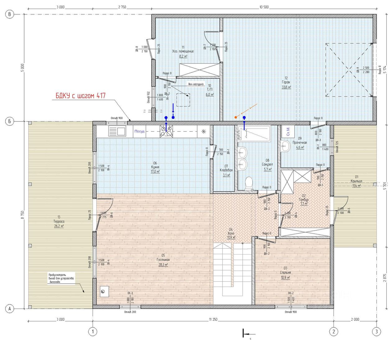 Фундамент: УШП (с коммуникациями внутри и тёплым полом).