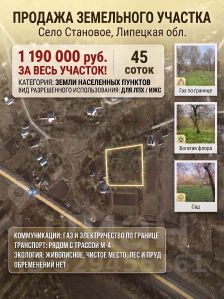 Продается просторный ровный участок в живописном и экологически чистом районе Липецкой области. Идеальный вариант как для строительства уютного загородного дома, так и для ведения личного подсобного хозяйства.