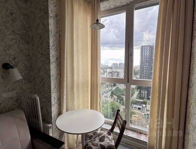 Большое окно, прекрасный вид, рабочая подоконная зона с мягкими дизайнерскими барными стульями.