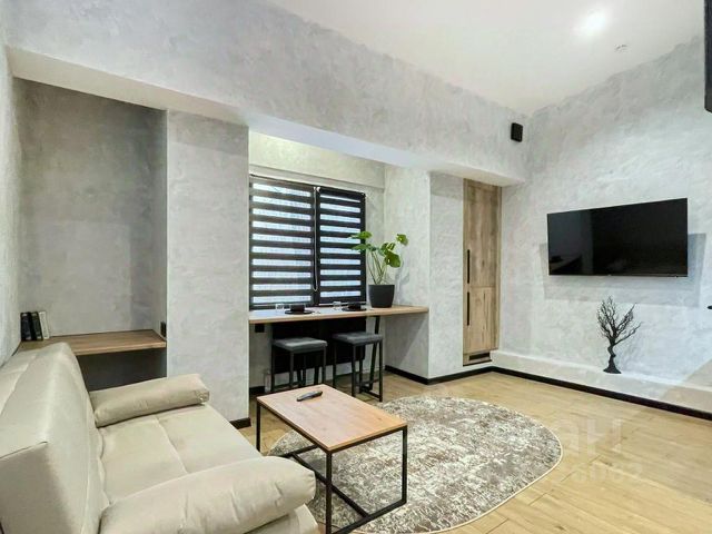 Это двухуровневая квартира-студия, общей площадью 23 кв.м (площадь по полу 17 кв.м.+ 6 кв.м. второй уровень). Благодаря домашнему интерьеру, исполненному в спокойных природных оттенках, и высоким потолкам (4,5 м) создается расслабленная атмосфера отдыха.