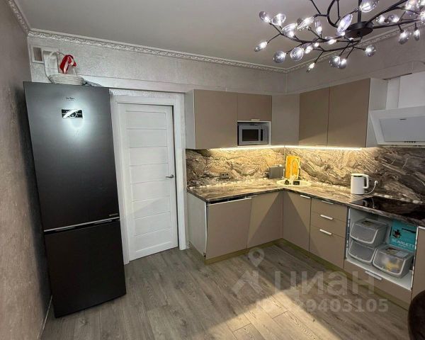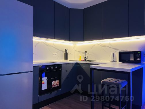 Кухня изготовлена на заказ в компании hoff, дверцы с доводчиками, барная стойка, позволяющая использовать её как рабочую зону для кухни, а также для приёма пищи. Оборудована подсветкой системы умного дома рабочей зоны кухни, а также встроенной варочной панелью и духовым шкафом, встроенной вытяжкой и отдельно стоящей микроволновой печью, посудой и столовыми приборами на 4 персоны, 2-мя бокалами. Стиральная машинка встроена в кухню, установлен холодильник indesit с функцией nofrost.