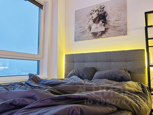 В спальной зоне с видом на закат с 32 этажа расположена двухместная кровать с мягким изголовьем и подсветкой системы умного дома. Кровать оборудована подъёмным механизмом для дополнительного места хранения вещей. Установлены регулируемые рулонные шторы black out.