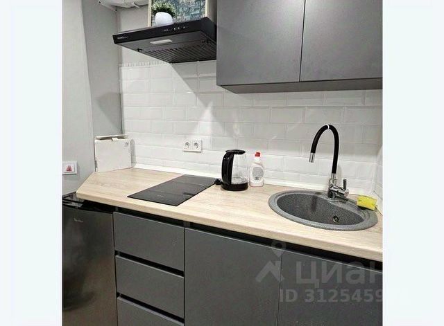 В кухонной зоне установлена варочная панель, чайник, микроволновка, холодильник, фильтр для воды, а также имеется необходимая для приготовления и приёма пищи посуда.