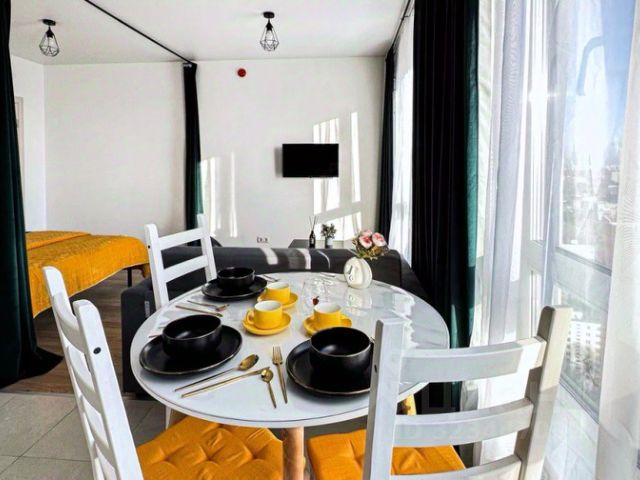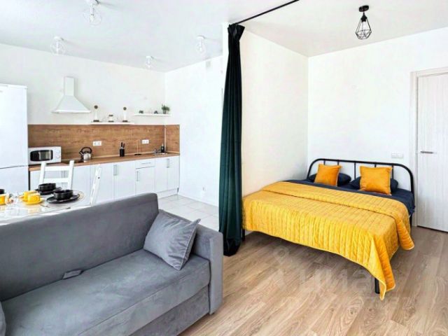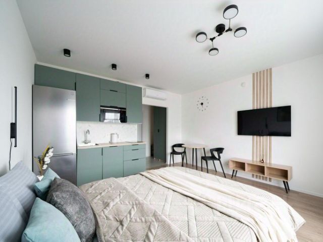 В студии имеется 2 раздельных спальных места - двуспальная кровать (140х200) и раскладной диван (120х200).