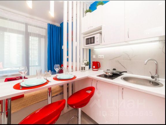 Студия подойдет для проживания 2 гостей. В апартаментах есть все для комфортного проживания: двуспальный диван 160 на 200, SMART-TV и высокоскоростной Wi-Fi, стиральная машинка, утюг, гладильная доска, сушилка для белья, фен. Мини-кухня оснащена холодильником, индукционной варочной панелью, СВЧ-печью, электрическим чайником, необходимой посудой и столовыми приборами. Постельное белье, полотенца, шампунь, гель для душа, жидкое мыло предоставляются.