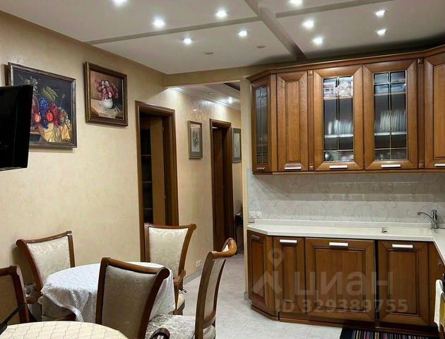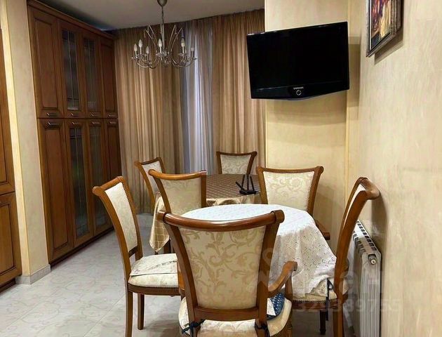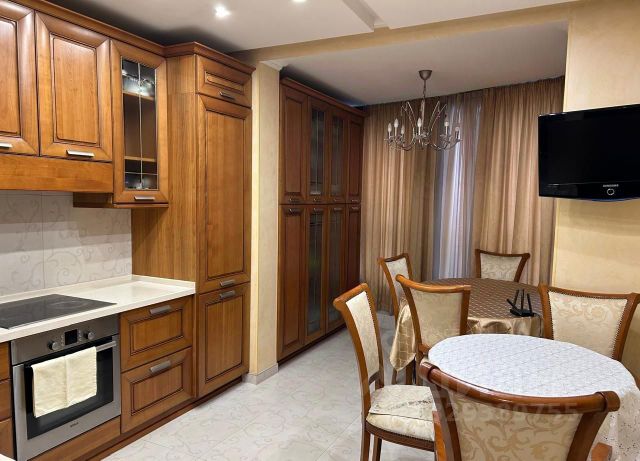 В кухне установлен новый гарнитур, выполненный на заказ с современной встроенной техникой известных брендов - электрический духовой шкаф, варочная панель, вытяжка, двухкамерный холодильник, посудомоечная машина, и СВЧ, раздвижной обеденный стол, удобные стулья и ТВ.
