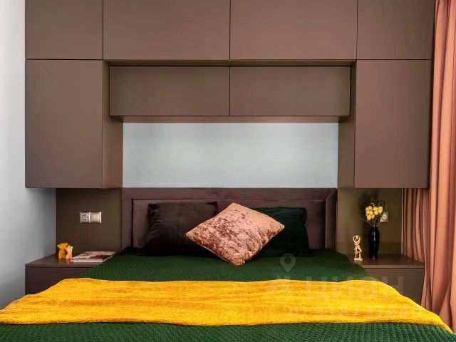 Для сна: комфортная кровать queen size с ортопедическим матрасом (160x200). Для гостей: раскладывающийся двуспальный диван. И ещё: утепленная лоджия с теплым полом, раздельный санузел, продуманное и вместительное хранение вещей, встроенная гладильная доска, рабочий стол.