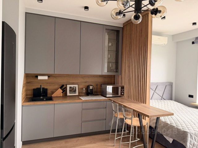 Функциональное и уютное зонирование апартамента: кухня-гостиная, спальня с выходом на панорамную лоджию, совмещенный санузел с душем, коридор Много мест для хранения. Апартамент оборудован всей необходимой импортной бытовой техникой: посудомоечная и стиральная машины, варочная панель, микроволновая печь, холодильник.