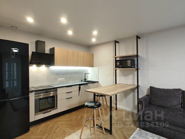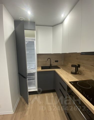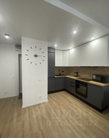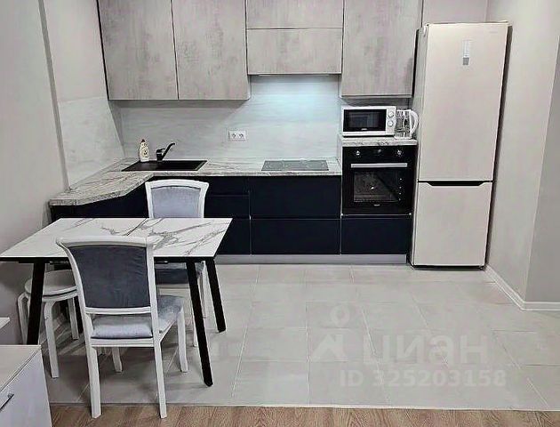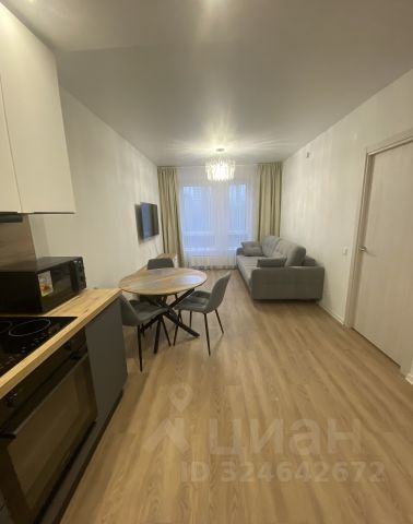 Кухонный гарнитур с доводчиками дверей в светлых тонах, столешница сделана из искусственного камня. Техника встроенная: варочная панель, духовой шкаф, микроволновка, вытяжка. Холодильник 2-х камерный, стоит в нише в прихожей, но можно его по желанию переместить на кухню. Обеденный стол, стулья. Выход на балкон с кухни. Окна на улицу. В комнате диван, тумба под телевизор, телевизор с плоским экраном. ПРИХОЖАЯ:
