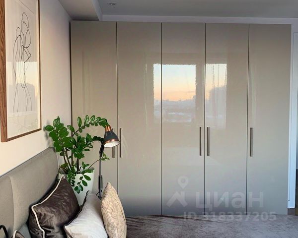В спальне площадью 13,9 м² — двуспальная кровать с ортопедическим матрасом, подъёмным механизмом и местом для хранения, вместительные платяные шкафы, подвесная полка с зеркалом и пуфиком