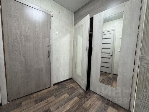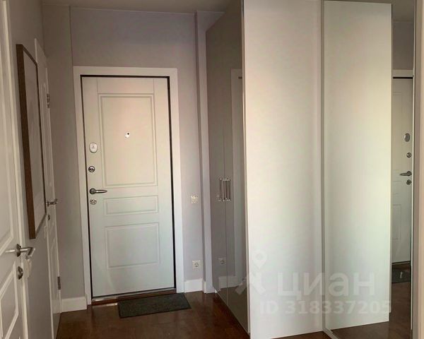 В прихожей встроенный шкаф под потолок, в спальне — встроенные шкафы, зона с зеркалом и пуфом.