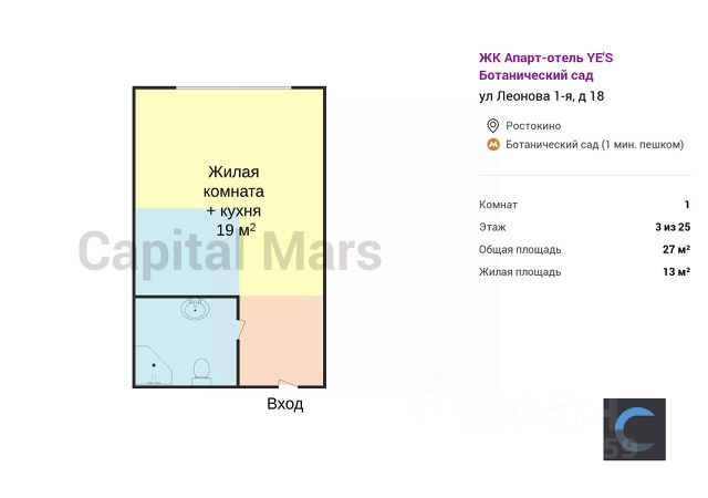 Предлагается студия в апарт-комплексе "YE'S Ботанический сад", рядом с одноименной станцией МЦК. Светлый интерьер дополнен необходимой для комфорта мебелью. На кухне - современная техника, включая духовую печь. Установлен кондиционер. В подъезде дежурит консьерж. На территории - подземный паркинг. Рядом открыты медцентры, сетевые магазины, кафе, кинотеатр, спортклубы и спа-салоны. Для прогулок - парк Сад будущего. Удобен выезд на СВХ и проспект Мира. - Страховой депозит можно оплатить 2-мя частями. - Аренда возможна с 8 октября. - Дом находится на охраняемой территории. - Квартиру представляет агент Capital Mars - Елена. - ID объекта 472480. Сдается 1-комнатная квартира на улице 1-я Леонова в Москве.
