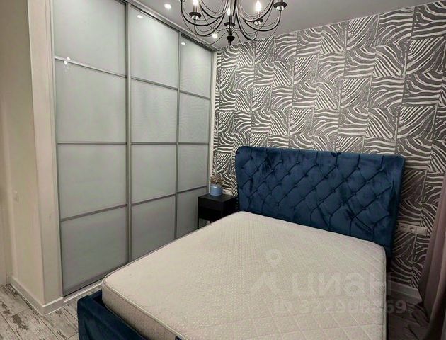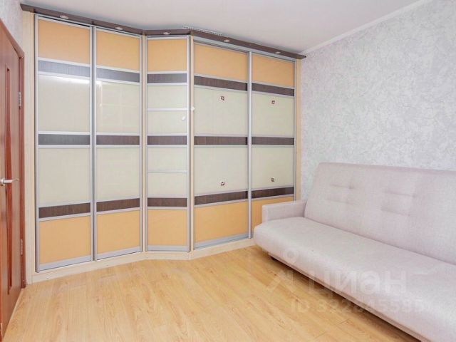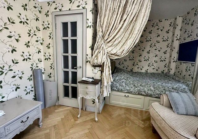 В жилой комнате 17кв.м., находится двухспальная кровать, две прикроватные тумбочки, комод, телевизор, встроенный шкаф-купе в потолок, люстра, кондиционер, дорогая паркетная доска.