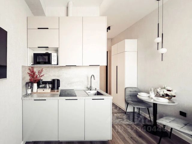 - мини кухня с индукционной плитой, краном фильтрованной воды, электрическим чайником, кофемашиной, тостером, холодильником, микроволновкой, всей необходимой посудой;