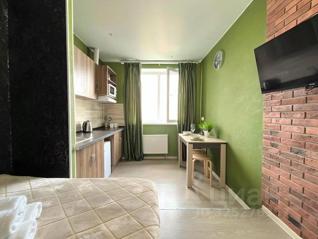 Апартаменты - студия в ЖК Нормандия. Название студии Dream Catcher выбрано не случайно - большое количество зеленых искусственных цветов, дерева, ловец снов и балийский стиль. Интерьер выполнен в индонезийском стиле: всё деревянненькое и немного потёртое. Напротив кровати стоит большой телевизор 43" с функцией смарт ТВ от Яндекс. В дополнение подключена подписка "Яндекс плюс", которая позволяет бесплатно просматривать фильмы из Кинопоиска.