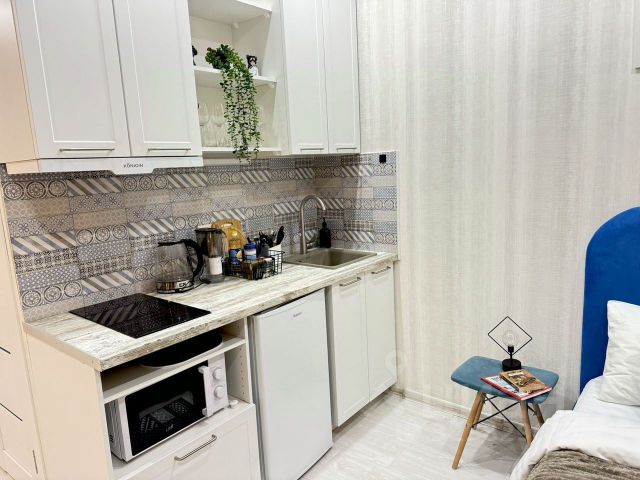 * мини-кухня со всем необходимым для приготовления пищи: холодильник, плита, СВЧ, чайник, кофемашина а так же набор посуды и кухонных приборов.